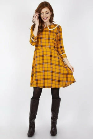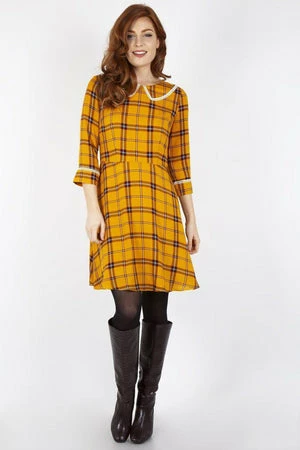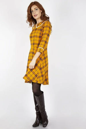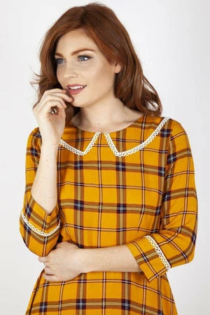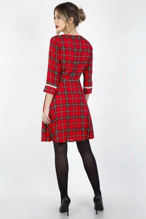 This design has a tartan design, round neckline, cuffs and collar with trimming details and it fastens at the back with an invisible zipper.