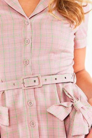 This sleeveless, midi dress has plaid design, blazer collar detail, matching belt detail, a V-neckline, a flattering fit, oversized bow details and it fastens at the front with buttons.