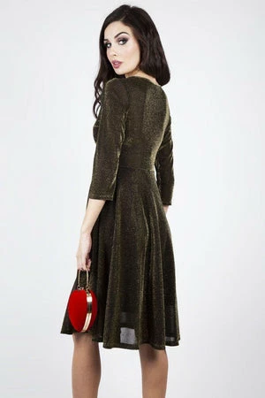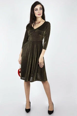 This midi disco flared gold dress has a V-neckline, three quarter length sleeves and a figure accentuating shape.