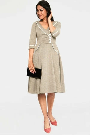 The midi dress has herringbone pattern, pockets, wide collar, button detailing, short sleeves, a V-neckline, a flattering fit and it fastens with a zipper at the back.