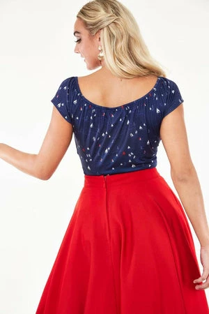 This top has marina sailboat design, ribbon tie detailing on the sleeves, short sleeves, cowl neckline and a flattering fit.