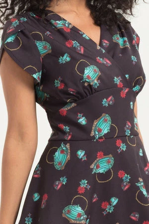This A-line midi dress has an oriental-inspired tea set themed print, wrap V-neckline, empire and midriff lines for fit and fastens at the back with a hidden zipper.