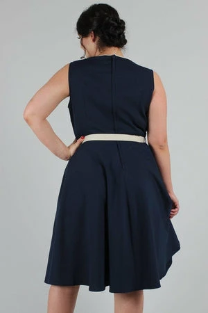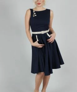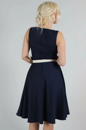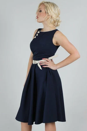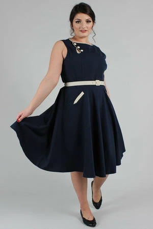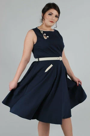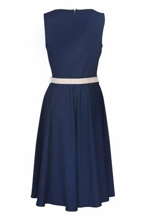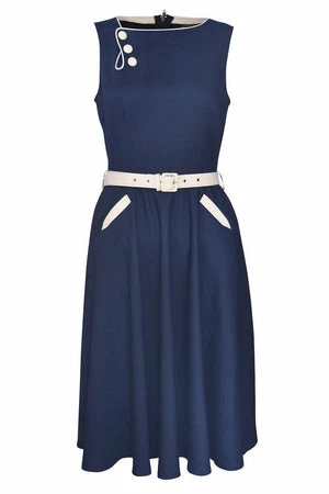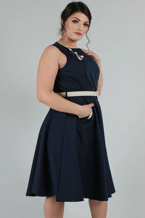 The sleeveless skater midi dress has a keyhole neckline, belt and button detailing, pockets, a flattering fit and it fastens with a zipper at the back.