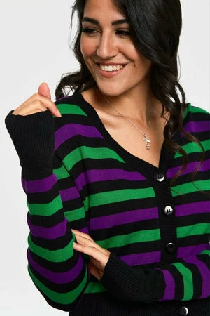 The knitted cardigan has green and purple stripes print, a V-neckline, full length sleeves, rib hem and cuffs and it fastens at the front with glossy buttons.