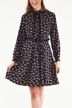 This mini dress has fox print, a high neckline, bow neck detailing and a flattering fit.