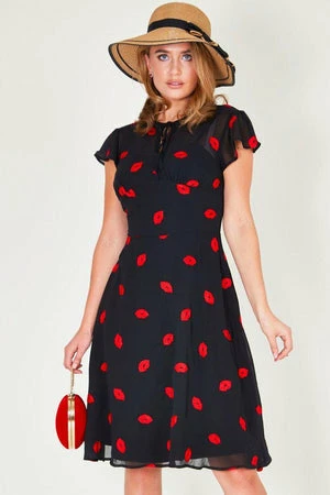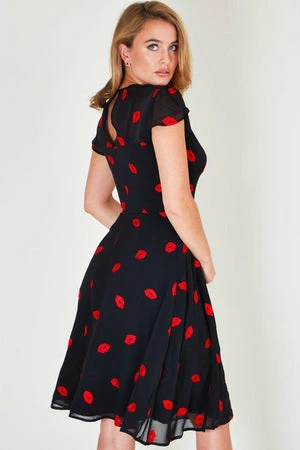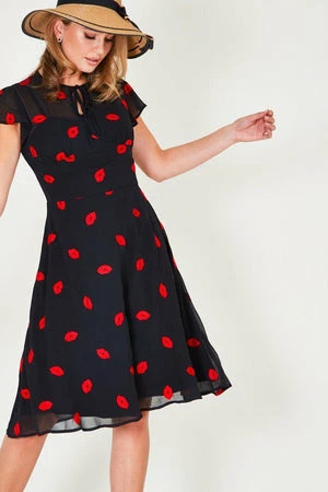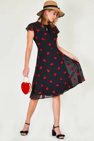 The A-line sheer dress has embroidered lips motif, loose capped sleeves, neck tie, keyhole opening, button closure, a flared skirt and it fastens with a zipper at the back.
