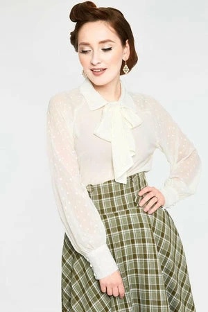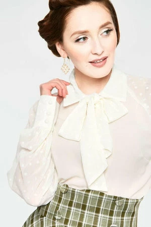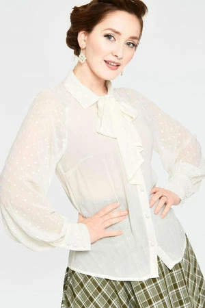 The chiffon shirt has floral embroideries, a high-neckline, long sleeves, tie bow at neck and a flattering fit.